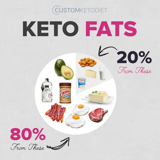 80% of the time, fats should come from healthy fat sources like avocado, MCT oil, butter, eggs, fatty meats, macadamia oil. While the remaining 20%, it should come from other fat sources like chia seeds, milk, flax seeds, nut butters, nuts, etc. But remember, these options from the 20% must be consumed in moderation as the carbs can add up easily.